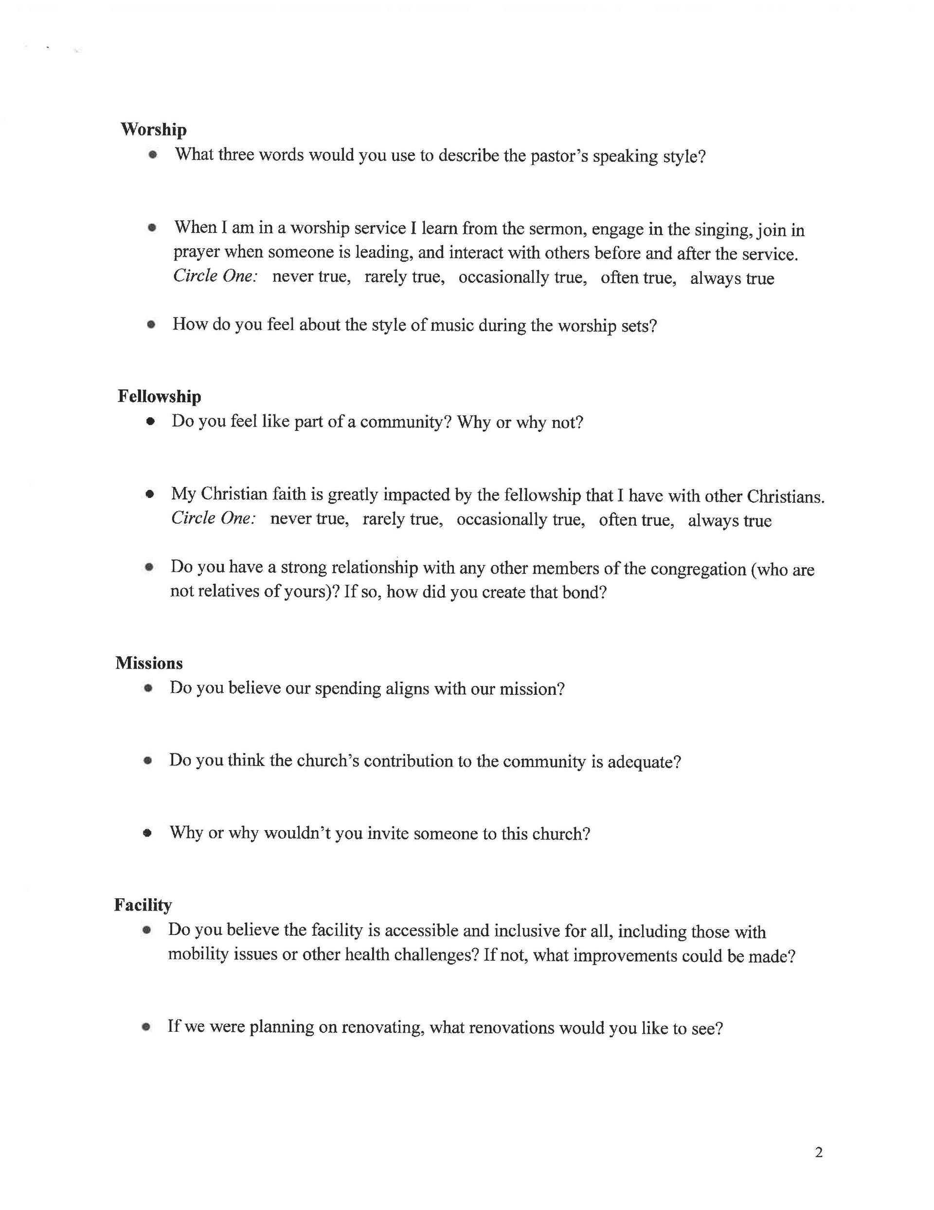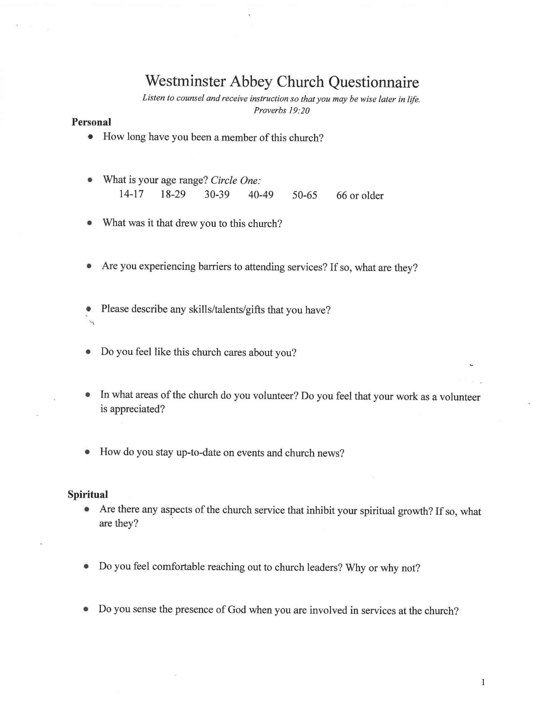 With God as our ultimate Shepherd of the Church . . . We are always looking to implement new concepts, missions, nurture, improvements and outreach for The Westminster Abbey Church. We would welcome your completion of the 2025 Church Questionnaire below that you can print out and return. Church Questionnaires can also be picked up at the Church. We thank you for your time, interest and participation in the 2025 Church Questionnaire. May God bless and guide you and yours.